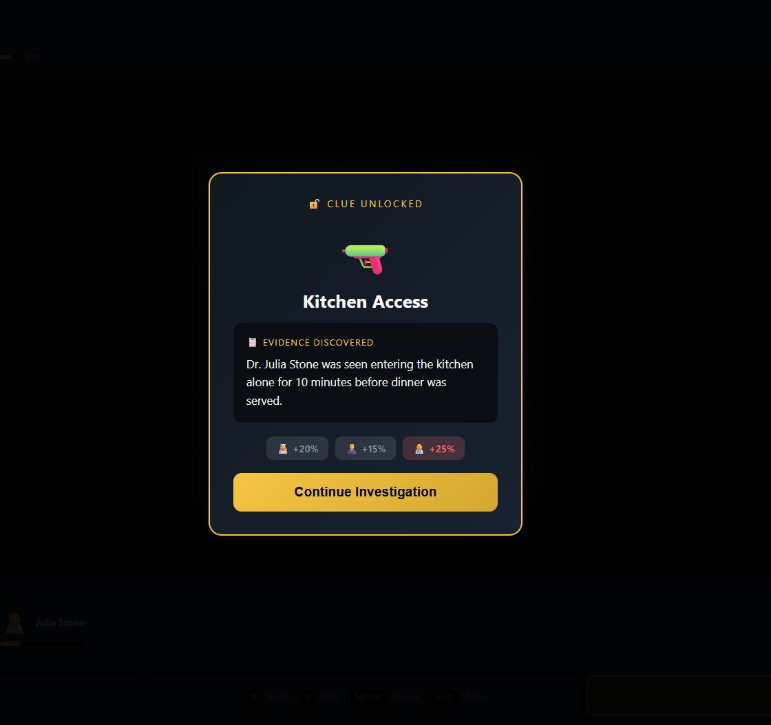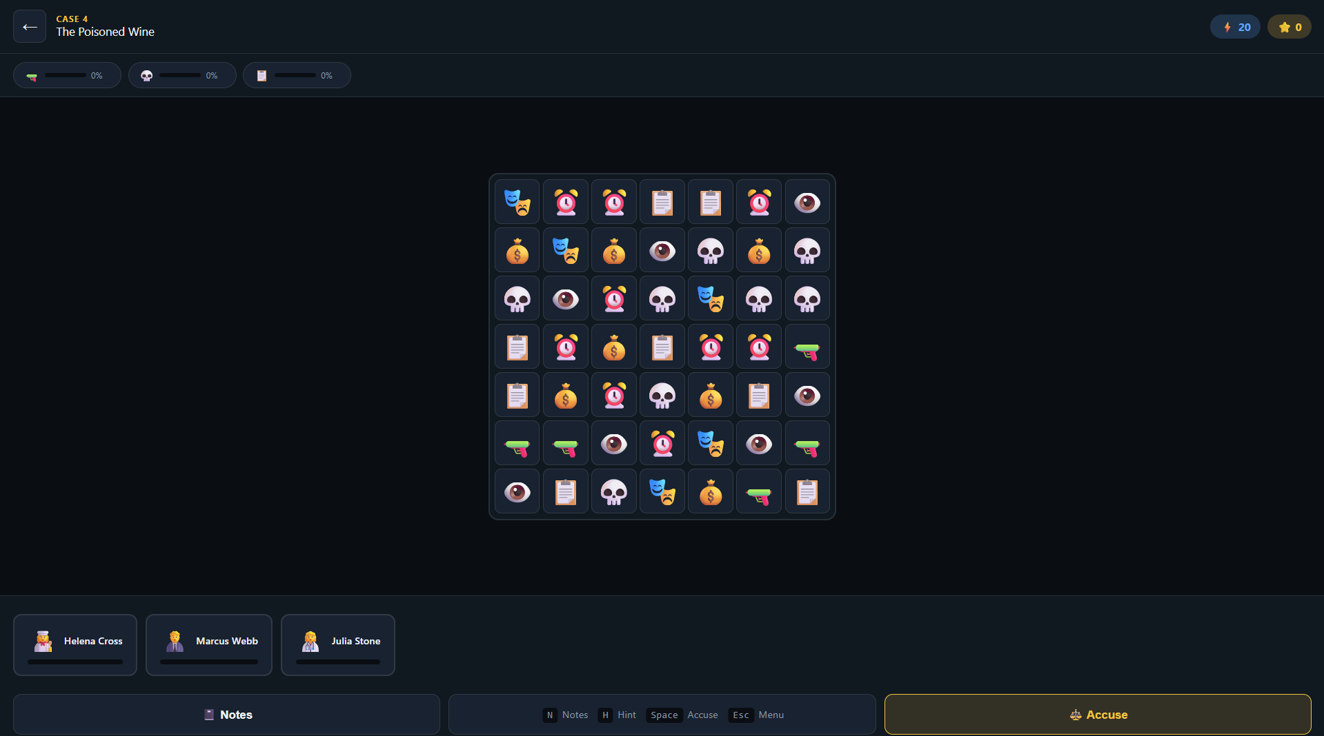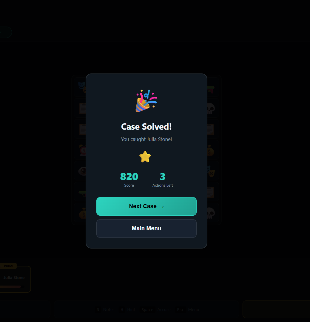 Match 3 or more evidence icons to gather clues and build your case. Each match reveals critical information about your suspects. Study the evidence, identify the prime suspect, and make your accusation. Choose wisely โ accuse the wrong person and the real killer walks free!